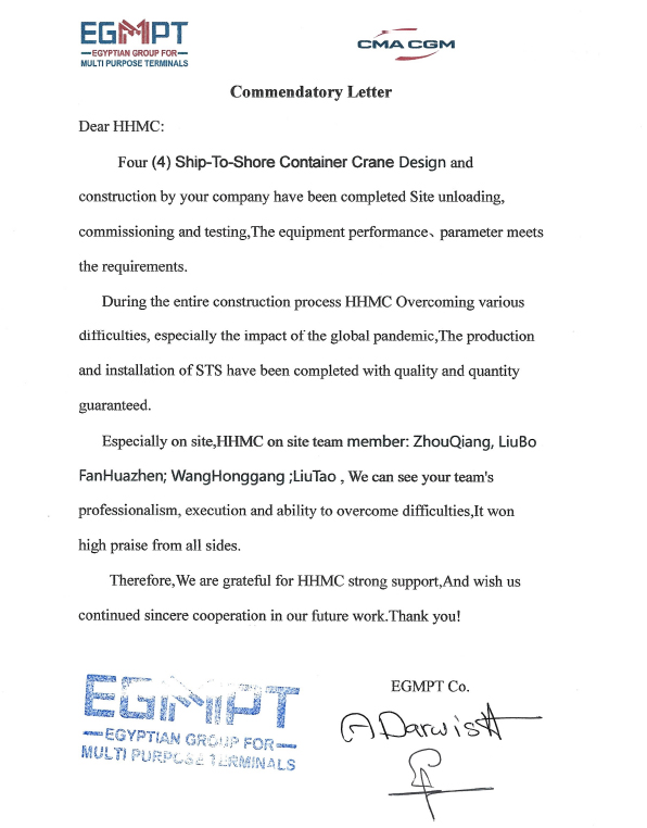 亞歷山大港多用途碼頭為埃及國(guó)家重點(diǎn)項(xiàng)目,埃及國(guó)家領(lǐng)導(dǎo)人員高度關(guān)注該項(xiàng)目進(jìn)展。岸橋到達(dá)用戶碼頭后,項(xiàng)目組嚴(yán)格按照策劃節(jié)點(diǎn)穩(wěn)步推進(jìn)每天工作,確保當(dāng)日事當(dāng)日畢,最終在整個(gè)項(xiàng)目組通力協(xié)作以及用戶的積極配合支持下,岸橋順利完成交付,并按計(jì)劃進(jìn)入保產(chǎn)。期間,埃及總理、交通部部長(zhǎng)對(duì)海西重機(jī)產(chǎn)品及現(xiàn)場(chǎng)項(xiàng)目團(tuán)隊(duì)給予了充分肯定,多家當(dāng)?shù)孛襟w對(duì)此進(jìn)行了專題報(bào)道。用戶特地向我司發(fā)來(lái)一封表?yè)P(yáng)信以示感謝。