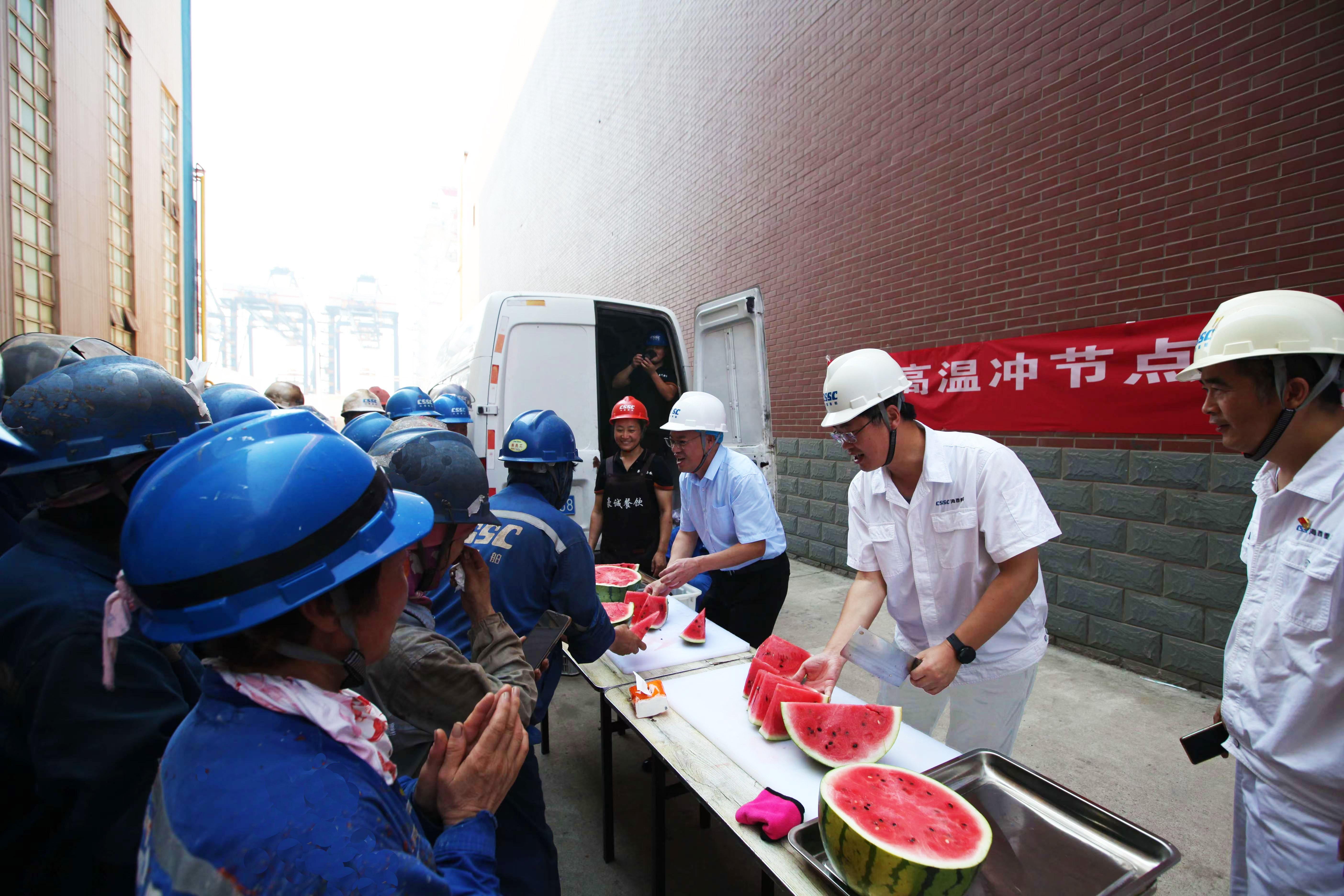 7月31日下午,武漢船機(jī)總會(huì)計(jì)師、工會(huì)主席陳世龍,海西重機(jī)總經(jīng)理蔣新標(biāo)、工會(huì)主席朱聲凱等公司領(lǐng)導(dǎo)來(lái)到生產(chǎn)現(xiàn)場(chǎng),為大家送上了解暑西瓜,表達(dá)了對(duì)一線員工的辛勤付出的感謝,叮囑大家高溫高濕天氣下要加強(qiáng)自我保護(hù),注意作息,確保平安度夏。