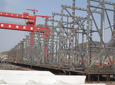 天津新港600T造船龍門吊是青島海西重機有限責任公司承接的第一臺大型龍門起重機,合同總額1.05億元,是公司關鍵項目。公司領導高度重視,專門成立了以公司總經(jīng)理為組長的項目組,在全公司實施精品戰(zhàn)略,本著“作一臺設備,占一片市場,交一個朋友”的宗旨,從聯(lián)合設計到注重制造的每一個細節(jié),海西重機都組織了多次討論,全力保證產(chǎn)品質量。