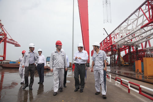 在參觀公司現(xiàn)場(chǎng)建成自用的1600噸龍門吊項(xiàng)目、正在吊裝上船的3600噸全回轉(zhuǎn)浮吊項(xiàng)目、面對(duì)公司的120米突堤碼頭以及繁忙的生產(chǎn)組裝現(xiàn)場(chǎng),董總對(duì)公司的經(jīng)營(yíng)發(fā)展態(tài)勢(shì)予以充分肯定。他說(shuō):在當(dāng)前市場(chǎng)經(jīng)濟(jì)低迷的形勢(shì)下,青島海西重機(jī)能夠抓住發(fā)展機(jī)遇,逆勢(shì)而上,尤其在技術(shù)創(chuàng)新和產(chǎn)品開發(fā)方面發(fā)揮了自身潛能,具有前瞻性和市場(chǎng)眼光,更是武漢船機(jī)公司在船市低迷的情況下,產(chǎn)品結(jié)構(gòu)調(diào)整的有力體現(xiàn)。董總特別對(duì)近期在煙臺(tái)、連云港、海南洋浦等港口項(xiàng)目投標(biāo)中,我司與上海振華同臺(tái)競(jìng)標(biāo)并連續(xù)奪得標(biāo)的給予了高度肯定。